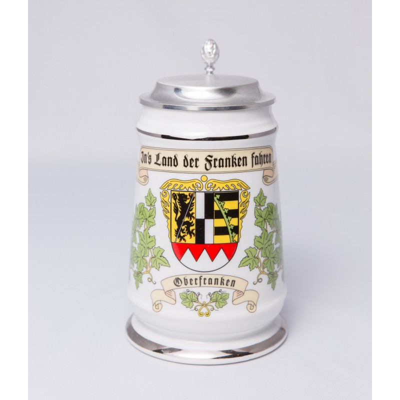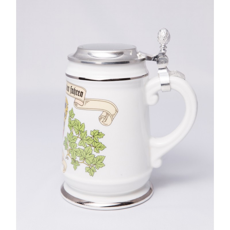 Porzellankrug "Ins Land der Franken fahren" mit Zinndeckel.Fassungsvermögen: 0,5 Liter